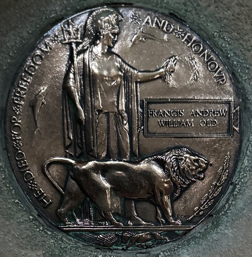 Francis Old’s Memorial Plaque or ‘Dead Man’s Penny’ set into the church wall.